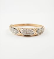 Bracelet rigide ouvrant en or 375 mil orné de 3 pavages de diamants brillantés (1,10 ct environ au total), avec double huit de sûreté (longueur : 14,5 cm) (soudures). 15,3 g. brut.
