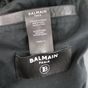 BALMAIN. Blouson d’homme en cuir Agneau noir, col rond, fermeture éclair et par boutons pression, épaules et manches longues embossées, poches poitrine, poches verticales et bas des manches zippés, pattes à pression à la ceinture, dos marqué en relief « BALMAIN PARIS ». Griffe noire, graphisme blanc. Taille 48. Avec cintre de la Maison. Bel état (légères griffures et salissures).