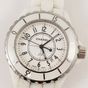 CHANEL. Bracelet-montre de dame "J12" Boitier rond (33mm environ) en acier et céramique blanche, lunette tournante unidirectionnelle. Cadran blanc nacré, chiffres arabes en applique, Mouvement à quartz, trotteuse centrale, guichet dateur à 4h30. Bracelet articulé en céramique blanche fermoir double dépliant invisible à ouverture à ressort, signé Chanel. Tour de poignet : 15cm environ. Sans écrin, ni papiers. Salissures.