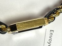 CHANEL. Bracelet montre « Première » en métal doré. Boîtier octogonal (26 x 20mm environ), cadran noir sans index, mouvement à quartz, fond clippé. Bracelet double rangs de chaîne en métal doré entrelacées de cuir noir. Signée et numérotée. Année de création 1987. Tour de poignet 16 cm environ. Taille M.