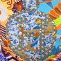 HERMES Paris. Châle en cachemire et soie imprimé, titré « Ex-libris en kimonos », multicolore, dominante bleue. Signé Anamorphée. (Anamorphée qui regroupe en fait deux graphistes : Charlotte Halpern et Bertrand Houdin : elle venait de la mode, lui de la publicité. Ce collectif a permis de mettre en commun leur talent au service du design graphique, agrémenté de leur goût pour le trompe l'œil, et les illusions d'optique.) Taches, fils tiré. 135 x 140 cm environ