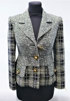 JACQUES FATH. Veste cintrée en coton tissé beige et marine à imprimé pieds de poule et géométrique, col cranté, simple boutonnage par trois boutons en métal doré à motif floral et au sigle de la Maison, deux poches à rabat et bouton simulées, manches longues. Griffe noire, graphisme blanc. Bel état (salissures).
