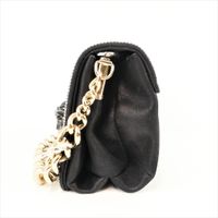 VERSACE. Splendide sac « La Medusa » en cuir noir métallisé incrusté de strass et orné d’une plaque en relief « Medusa » en résine ton sur ton. Importante anse chaîne en métal doré. Porté main ou épaule. Intérieur en tissu noir, deux compartiments et deux poches plaquées. Fermoir sur rabat à bouton pression magnétique. Très bon état. 17 x 24 x 6cm environ.