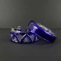 BACCARAT - Article de toilette : Boîte à poudre de forme ronde en cristal blanc transparent et overlay bleu cobalt. Signature en lettres cursives sous la base. Diamètre : 11cm ; Hauteur : 6cm. (Eclat au rebord sous couvercle, légères rayures).