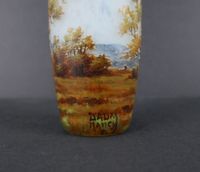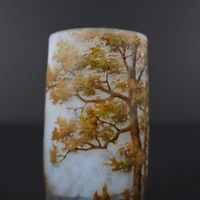 DAUM Nancy. « Paysage d’Automne ». Vase gobelet légèrement fuselé. Epreuve en verre multicouches à décor dégagé à l’acide rehaussé d’émail polychrome, sur fond marmoréen bleuté. Signé au talon « Daum Nancy Croix de Lorraine ». Hauteur : 11cm. (Infimes éclats sous la base)