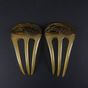 Deux Peignes de chignon à trois dents en corne blonde, la galerie à décor de pommes de pin. Travail Art Nouveau, vers 1900. (Dimensions : 12,5x7cm). (Légères déformations).