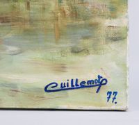 Georgette GUILLEMOT (XXe siècle) « Le Marché », 1977 et « Le Moulin de Jarcy » 2 Huiles sur toile, signées en bas à droite, l’une située et contresignée sur le châssis. Dimensions : 60x73cm et 65x81cm. (Quelques manques de matière) (Non encadrées)