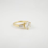 Bague solitaire en or 750 mil. ornée d’un diamant DT de 1,30 carat environ épaulé de 2 diamants taille baguette (TDD : 47,5). 2,8 g. brut