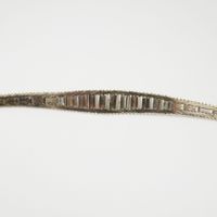 Bracelet en or gris 585 mil à maillons en chute sertis d’une ligne de diamants brillantés (longueur réglable : 18 à 19,5 cm) (soudures, accidents, déformations). 20,9 g. brut.