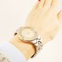 Bracelet-montre EBEL « Sportwave » en acier, boîtier rond (diamètre : 36 mm environ), lunette à décor de vis en métal doré, cadran ivoire à index bâton doré, guichet dateur à 3H, mouvement à quartz sur bracelet articulé en acier à boucle déployante papillon signée (longueur : 16,5 cm environ) (usures).