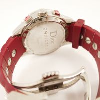 Montre-bracelet chronographe DIOR « Christal Rubber » rouge en acier, boîtier rond, lunette tournante sertie de diamants brillantés et de pierres imitation rouge, cadran rouge à chiffres arabes, à 3 compteurs secondaires et guichet dateur à 4H30, mouvement à quartz, sur bracelet en caoutchouc rouge rehaussé d’un rang de pierres imitation rouge facettées, boucle papillon déployante en acier signée. (Diamètre du boîtier : 39 mm environ).