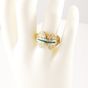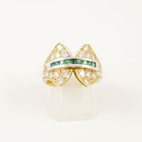 Bague en or 750 mil barrée d'une ligne de pierres vertes calibrées en serti rail (1 pierre cassée) dans 2 motifs éventails diamantés (TDD : 56). 7,9 g brut.