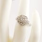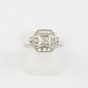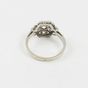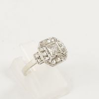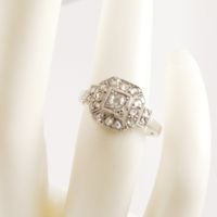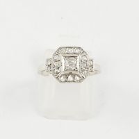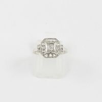 Bague en or 750 mil et platine 850 mil à chaton carré à pans coupés (Dim : 1 cm environ) centré d'un diamant TA entouré et épaulé de roses (TDD : 50). 2,6 g brut.