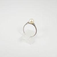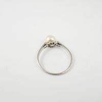 Bague en platine 950 mil. ornée d’une perle de culture (diamètre : 7 mm environ) épaulée de diamants taille ancienne. Travail français début XXème siècle, numérotée. (TDD : 57). (Usures, trace de mise à grandeur). 2,7 g. brut