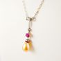 Collier « Nœud » en or 750 mil. et platine 850 mil. à fine maille retenant un rubis taille ovale et une perle dorée de forme goutte de culture ou fine (non testée) (10,5 x 9 mm), rehaussé de rubis calibrés, de diamants taille ancienne et taillés en rose. Travail du début XX ème. (Longueur : 37,5 cm environ). (Restauration à la maille, usures). 3,7 g. brut
