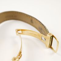 Montre-bracelet de dame CARTIER « Tank » en or 750 mil., boitier rectangulaire (28 x 20 mm environ), cadran blanc à chiffres romains peints pour les heures, chemin de fer pour les minutes, mouvement mécanique avec remontoir orné d’un saphir cabochon et fond à vis, sur bracelet en cuir usagé à boucle déployante en or 750 mil. signée Cartier. Signée et numérotée. (Tour de poignet : 18,5 cm environ). 31,7 g. brut. (Sans écrin, ni papiers).