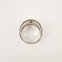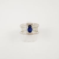 Bague bandeau moderniste en or gris 750 mil composée de deux lignes de diamants taille brillant retenant un saphir ovale, surplombant un pavage de diamants taille brillant. (TDD : 55 ; Largeur : 12mm). 8,6 g. brut