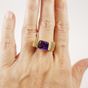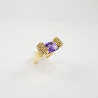 Bague en or 750 mil centrée d’une améthyste taille coussin, épaulée d’enroulements sertis de diamants taille brillant. (TDD : 62). (Serti de la pierre centrale à revoir). 12,8 g. brut