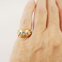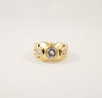 Bague jonc texturée en or 750 mil ornée de trois diamants taille brillant en sertis clos, dont un de 0.50ct environ et deux de 0.07ct environ. (TDD : 50,5 ; Largeur : 10mm). (Usures à l’or). 7,3 g. brut