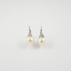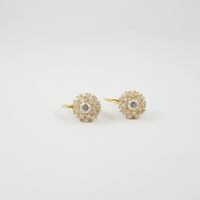 Paire de dormeuses en or 750 mil serties de pierres imitation incolores. (Hauteur : 2cm environ). (Légères déformations). 6 g. brut