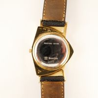Montre-bracelet d’homme HAMILTON « Ventura » en métal doré, boîtier triangulaire fantaisie, cadran champagne, index à pastilles dorées appliquées, mouvement à quartz, bracelet en cuir usagé et boucle à ardillon en métal non d’origine. Signée et numérotée. (Dim boîtier : 4,7 x 3 cm environ, longueur totale : 22,7 cm ) (verre rayé).