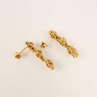 Paire de pendants d’oreilles en or 750 mil composés de 3 motifs floraux stylisés en chute pavés de diamants brillantés et tapers (0.01 et 0.02 carats environ) (hauteur : 32 mm).9,4 g. brut