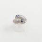 Bague croisée en or rhodié 750 mil ornée à ses extrémités de deux saphirs ronds dans un pavage de diamants et diamants 8/8 (TDD : 52). 9,2 g brut.