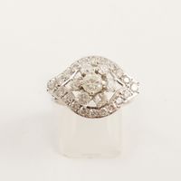 Bague en or gris 585 mil à chaton navette centré et entouré de diamants, le plus important central d'environ 0,30 ct (TDD : 55,5). 5,2 g brut.