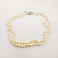 Collier de 2 rangs de perles de culture en chute (de 0,5 à 0,9 cm environ), fermoir en or gris 750 mil figurant un motif floral orné de diamants TA et navette (Long : 51 cm). 62,1 g brut.