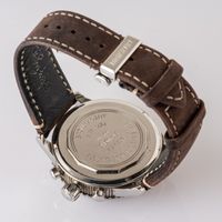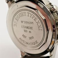 BREGUET, Type XXI. Montre d’homme ronde chronographe à fonction retour de vol. Référence 3810. Boîtier en acier numéroté 39491. Cadran anthracite, chiffres arabes et aiguilles luminescents. Trois sous-compteurs et guichet date à 6h. Mouvement mécanique à remontage automatique à fonction « flyback ». Tige de remontoir cassée, prévoir une révision. Diamètre : 43 mm environ. Bracelet signé et boucle déployante signée. Écrin, surboîte et bracelet cuir usé supplémentaire. Sans papiers.
