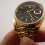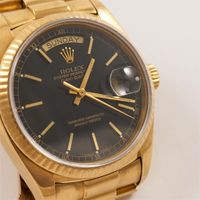 ROLEX, Day-date. Montre d’homme ronde. Référence 18038. Boîtier en or jaune 750 millièmes numéroté 6263119. Cadran noir à index appliqués et chiffres romains, guichet jour à 12h et date à 3h. Mouvement mécanique à remontage automatique. Calibre 3055 signé. Diamètre : 36 mm environ. Bracelet Président en or jaune 750 millièmes référence 18000 avec boucle déployante signée. Poids brut : 131 g. Écrin, surboîte, sans papiers.
