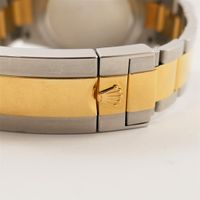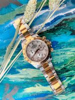 ROLEX, Daytona. Montre d’homme ronde chronographe. Référence 116523. Boîtier en acier. Lunette, poussoirs et couronne en or jaune 750 millièmes. Cadran nacré à index diamants, trois sous-compteurs et aiguilles luminescentes. Mouvement mécanique à remontage automatique. Calibre 4130. Diamètre : 40 mm environ. Bracelet Oyster en acier et maillons centraux en or jaune 750 millièmes.Poids brut : 157,6 g. Sans écrin ni papiers.E) (art. 524 bis du CGI, al.C).