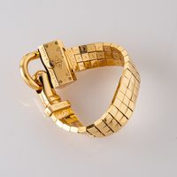 VAN CLEEF & ARPELS, Cadenas. Montre de femme rectangulaire. Boîtier en or jaune 750 millièmes numéroté 154336 signé. Cadran guilloché crème à index appliqués et diamant à 12h. Mouvement quartz. Dimensions : 24 × 28 mm environ. Bracelet intégré en or jaune 750 millièmes avec attache type crochet. Poids brut : 107 g. Sans écrin ni papiers.