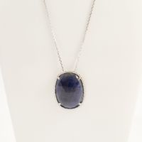 Assorti avec le lot 95 : Pendentif en or gris 750 mil ornée d’une racine de saphir facetté ovale dans un entourage de diamants taille brillant. (Dimensions : 3,2x2,5cm environ), et Collier en or gris 750 mil à maille forçat. (Longueur : 51 cm environ). 13,4 g. brut.