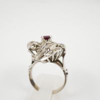 Bague en métal à motif floral stylisé centrée d'un rubis rond rehaussé de diamants 8/8. (TDD : 56) (Traces de soudures).