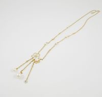 Collier en or 750 mil à maillons forçat retenant un motif central de deux fleurs ajourées et trois pampilles, rehaussées de perles de culture et diamants taille brillant. (Longueur : 41cm, hauteur du motif : 5,5cm environ). 5 g brut.