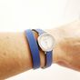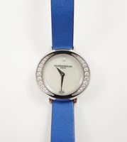 Montre-bracelet de dame BAUME & MERCIER « Petite Promesse » en acier, boîtier rond rehaussé de diamants taille brillant, cadran en nacre muet à 2 index diamantés, fond vissé, mouvement à quartz, sur bracelet double tour en cuir bleu et boucle ardillon en métal. Référence 6581. Signée et numérotée. (Diamètre : 22mm).