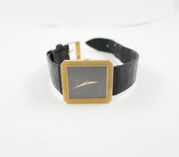 *Montre-bracelet d'homme PIAGET en or 750 mil, boîtier rectangulaire à pans coupés rainuré, cadran noir muet, fond clippé, mouvement mécanique, sur bracelet cuir usagé à boucle ardillon en or 750 mil siglée. (Diamètre : 25x27mm). 26,8 g brut.