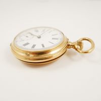 Montre de gousset en or 750 mil., dos et carrure lisse, cadran émaillé blanc à chiffres romains et arabes, petite seconde à 6H, mouvement mécanique, cuvette en or 750 mil signée Antony Bailly à Lyon et numérotée, dos orné d’une couronne comtale surmontant des armoiries d’alliance. Poinçon Tête de Cheval, Départements, 1838-1919. (Diamètre : 48mm environ). 98,1 g. brut.