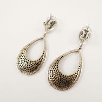 Paire de boutons clips d’oreilles en or gris 750 mil de forme goutte ajourée pavée de diamants noirs taille brillant rehaussé d’un entourage de diamants blancs. (Hauteur : 5,5cm environ). 12,5 g. brut.