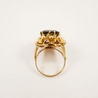 Bague en or 750 mil à chaton rectangulaire juponné centré d’une pierre de synthèse rectangulaire dans les tons orangés en serti griffes. Travail français des années 1950. (TDD : 55 ; Dimensions chaton : 25x19mm). (Egrisures, petits chocs, légères déformations). 8,7 g. brut