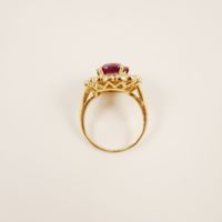 Bague en or 750 mil centrée d’une pierre composite rouge ovale dans un entourage de diamants taille brillant (16x0.07ct environ). (TDD : 60 ; Dimensions chaton : 22x19mm). (Egrisures, fêles, serti de la pierre centrale à revoir). 8,3 g. brut