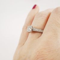 Bague en or gris 750 mil à chaton circulaire orné, en serti illusion, de diamants taille brillant, épaulé de diamants taille brillant. (TDD : 51 ; Diamètre chaton : 6.8mm). (Trace de mise à taille). 3,1 g. brut
