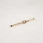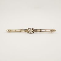 Broche barrette ajourée en or gris 750 mil à motifs feuillagés stylisés, sertie de diamants tailles ancienne et roses (le central de 0.25ct environ). Travail du début du XXe siècle. (Longueur : 7,7cm). (Oxydations, éclats, manques de matière, épingle légèrement déformée). 5,8 g. brut