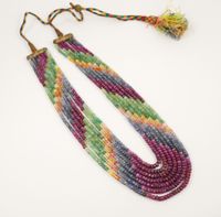 Collier de 7 rangs de corindons et béryls facettés, montés sur fil tissé, fermoir coulissant. Travail indien. (Longueur maximale : 80cm environ). (Usures au tissu, égrisures, fêles, petits manques de matière).