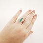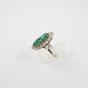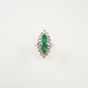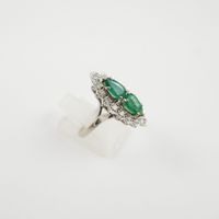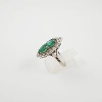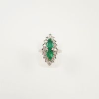 Bague marquise en or gris 750 mil. centrée de deux émeraudes taille poire de 0,35 carat chacune environ dans un entourage festonné de diamants brillantés. (TDD : 52). (Dimensions chaton : 23 x 10 mm environ). (Egrisures). 5,8 g. brut