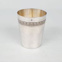 Albert DEFLON (actif 1907-1920) : timbale en argent 950 mil. de style Empire à fris de feuilles d’eau. Minerve 1 er titre de 1838 et poinçon de Maître. Poids : 73.2 g. H. 7.5 cm. Non chiffrée. Légères rayures. TBE.