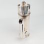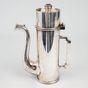 Cafetière thermos du XXe siècle en métal argenté uni de forme tubulaire haute à bords mouluré de filets forts, le bec volute à agrafe feuillagée, l’anse à degrés et le couvercle à charnière lourde et frétel en disque. Style des années trente. Sans trace d’orfèvre, ni poinçons. Soudures. H. 26 cm.