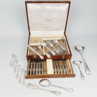 CHRISTOFLE, MARLY, Années 1950 : ménagère rocaille de 62 pièces en métal argenté dans son coffret en bois d’origine intérieur défraichi comprenant 12 grandes fourchettes, 12 grandes cuillers, 10 cuillers à café, 12 grands et 12 petits couteaux, 1 louche, 1 couvert à servir et 1 cuiller à sauce. Signée Christofle. Poinçons période 1935-1983. Le marquage des lames de couteau Christofle italique avec la mention inox dans un trèfle est appliqué de 1921 à 1968. Légères rayures. TBE. Non chiffrée. L. d’un couvert de table : 20.5 cm. Coffret accidenté sur le panneau du tiroir supérieur. + 6 Fourchettes à huîtres de la S.F.AM. en métal argenté de style Louis XVI à lauriers et tambourin de la même période.