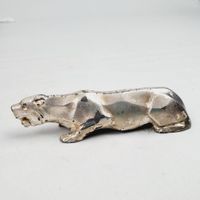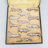 D’après EDOUARD MARCEL SANDOZ (1881-1971) : suite de 12 porte-couteaux animaliers en métal/étain argenté comprenant 1 sauterelle, 1 lion, 1 rhinocéros, 1 éléphant, 1 colombe, 1 panthère, 1 faucon, 1 poisson, 1 coq, 1 singe, 1 phoque et 1 homard. Sans traces de poinçons. L. du homard : 10.5 cm. Une patte cassée sur le faucon. Usures au placage. Ecrin défraichi.